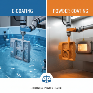 The Differences Between E-Coating vs. Powder Coating: A Manufacturing Decision-Maker’s Guide E-coating (electrocoating) uses electrical current to deposit liquid paint onto metal parts, while powder